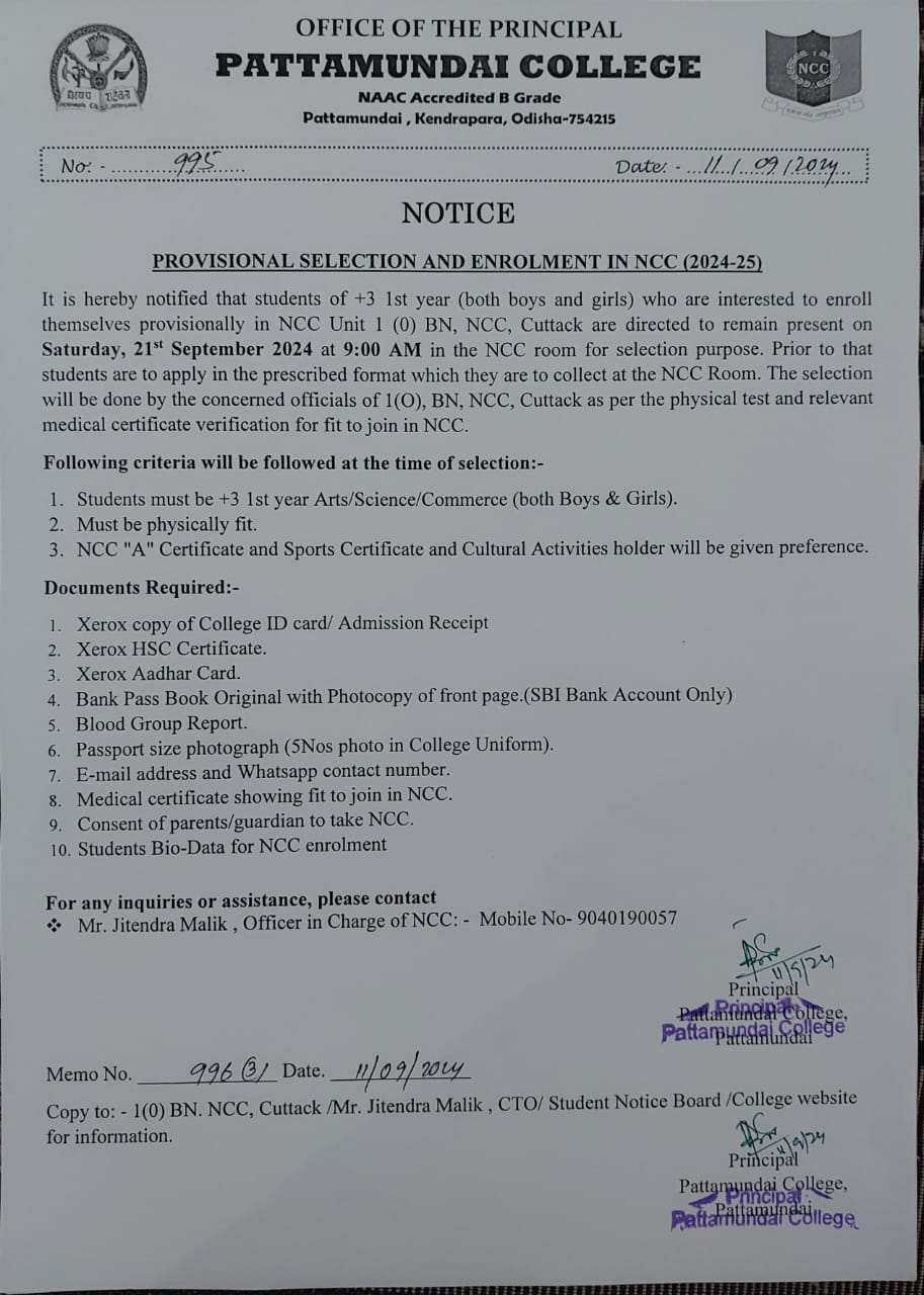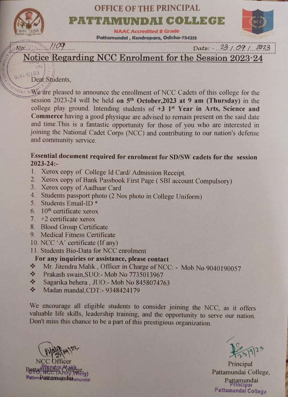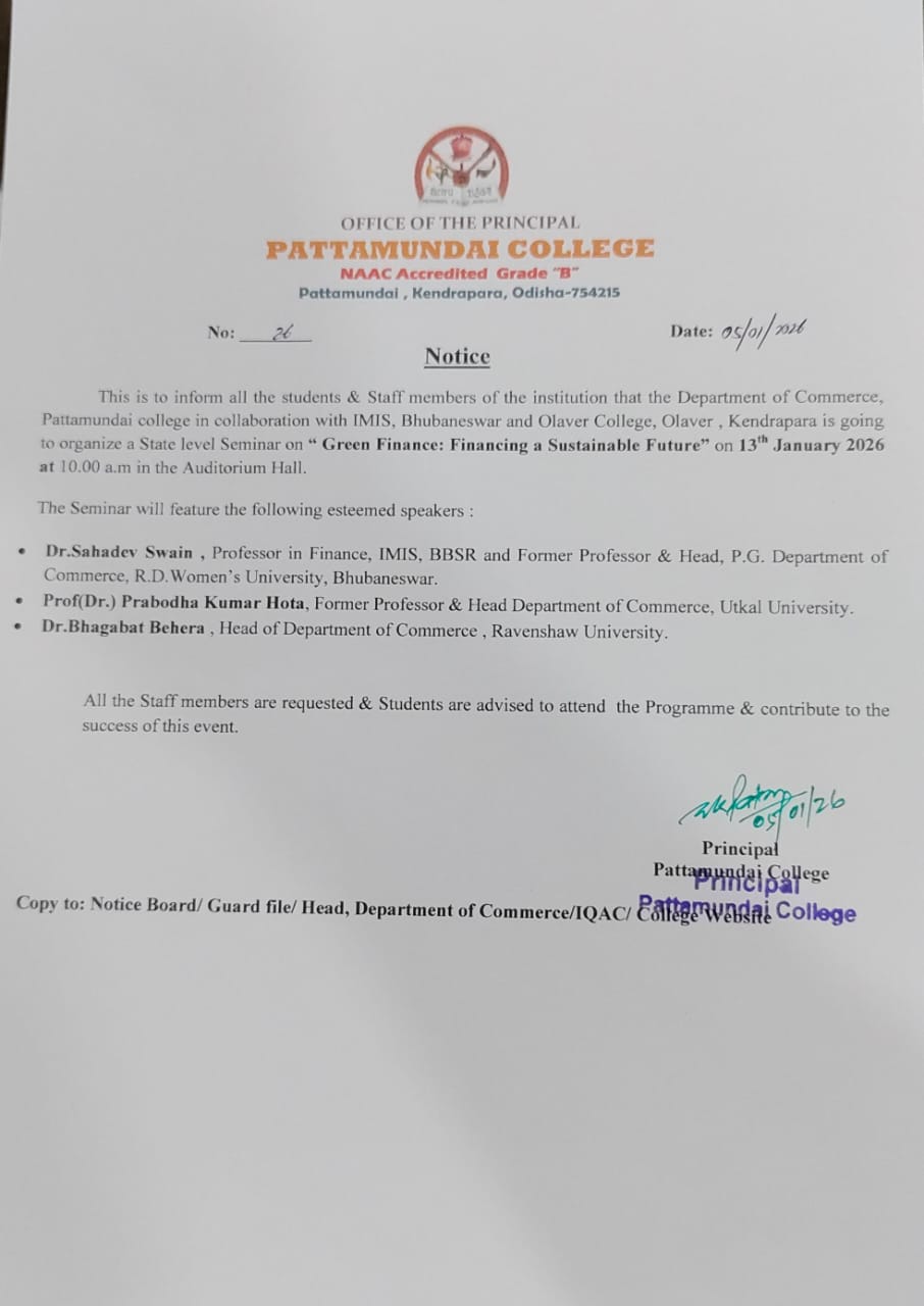 Established in 1970, Pattamundai College has achieved a reputation for nurturing and promoting excellence. Over the years, the college has made remarkable progress in the fields of both academic and extra-curricular activities. This institution caters to the learning needs of more than 2500 students and has emerged as one of the most sought-after colleges in Odisha. The immensely talented and highly committed faculty members of the college are actively engaged in shaping young minds and generating new knowledge through research. The members of its non-teaching staff are highly dedicated individuals who work towards creating an environment conducive to teaching and learning. The learning process at Pattamundai College includes lectures, seminars, workshops, power-point presentations and conferences which expose students to new currents of thought and endow them with valuable life-skills. By training students to think critically and sharpening their powers of analysis, the college equips them to measure up to the challenges of the future. The college has active NCC and NSS units along with several other student-faculty initiatives that help the college render its institutional social responsibilities.